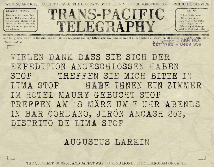 Jackson Elias sagt, die Leute in Puno haben ihn vor Larkin und seinen Bodyguard gewarnt, es sind wohl Vampire. Ein lokaler Professor war wohl interessiert an der Expedition, aber wurde eingeladen.