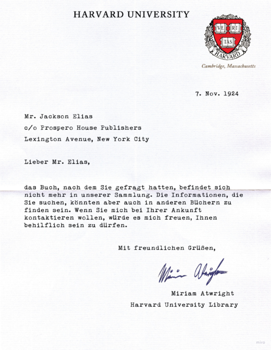 Unter dem Schreibtisch liegt noch ein zusammengefaltetes Stück Papier. Es ist ein Brief der Universitätsbibliothek Harvard.
